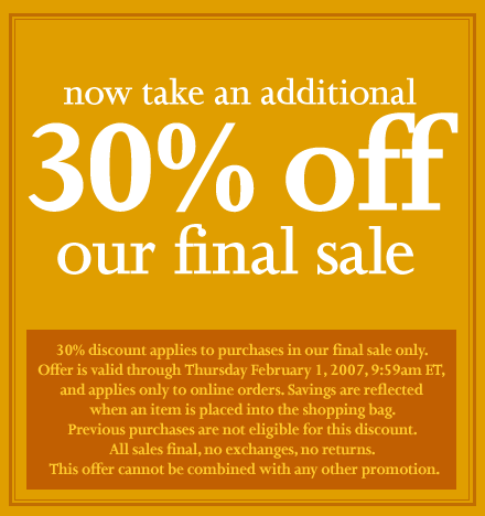 01/29/07: 日本時間2月1日夜11時までジェークリューの最終セール品注文はさらに30%オフ(J.Crew)