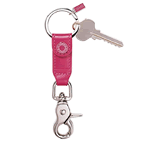トリガースナップキーフォブ、商品番号1661。レザーの部分がピンク(写真)、ブルー、白の3色あります。米国定価28ドル。縦約5p×横約2p、キーリングは約3pです。気になるお値段は本体4,482円、代行手数料1000円、日米間GPM配送656円で合計6,138円です。ギフト梱包しても同じ日米送料、同額ですよ。
