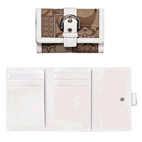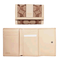 ハンプトンズ・シグネチャー・ミニウォレット、商品番号6K05。シグネチャージャガードにレザートリムです。米国定価148ドル。縦約8.25p×横約10.5p×厚さ約3pです。これだけ小さいのに必要なものが全て入る優れものです。気になるお値段は本体21,255円、代行手数料2000円、日米間GPM配送625円で合計23,880円。(日本コーチでは32,550円で販売されているそうですので、全て込みこみでも27%オフになりますね)送料追加分をご負担いただければもちろんコーチ正規店舗のロゴ入りギフトボックス梱包してお送りできますよ。ギフトボックスにお入れした場合の日米間送料は1,188円です。お色はオパール(水色)、グリーン、黒、カーキ(写真)があります。